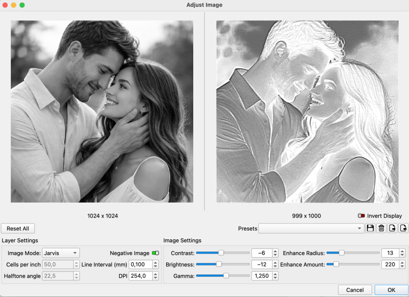 Her tar jeg utgangspunkt i et AI-generert bilde av et forelsket par 😉 Dette skal graveres på en skiferbrikke på ca. 10 x 10 cm. Jeg importerer først fargebildet i LightBurn, hvor det automatisk blir gjort om til sort/hvitt.